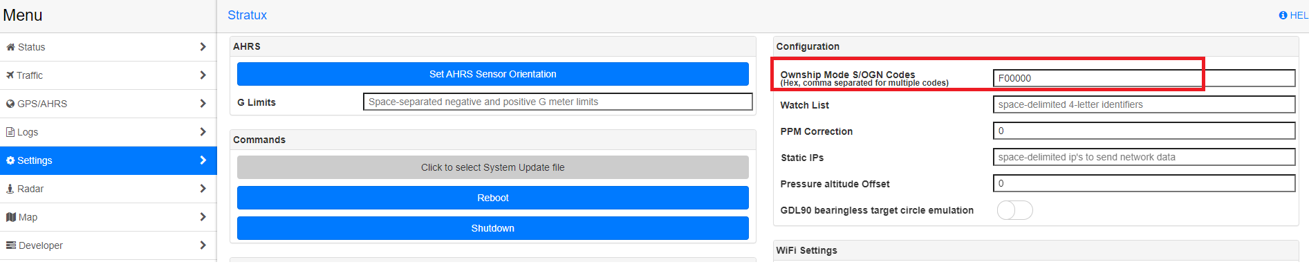 Configure your Stratux device including WiFi settings, network configuration, data output options, and hardware preferences. Set WiFi password, change SSID, configure GDL90 output ports, and adjust calibration parameters.